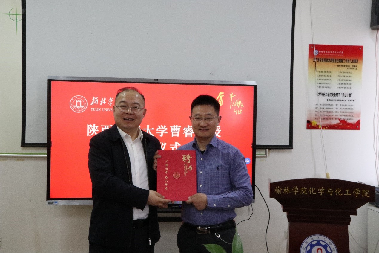 闫龙为曹睿教授颁发了聘任证书,对曹睿教授的到来表示热烈的欢迎和感谢。他指出,立足学校发展全局,聘任曹睿为万象城特聘教授,有利于提升万象城人才培养质量,形成优质教学、高水平科研的良性循环;促进教师能力的发展,打造前沿的、特色化的教学体系;强化社会服务能力,发挥特色专业优势示范效应,不断提升学校的发展层次和发展水平。化学与化工学院院长对曹睿教授作简要介绍,并宣读了聘任文件。