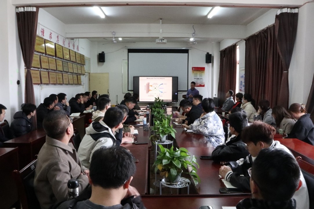 聘任仪式结束后,曹睿教授为学院师生作题为“分子电催化”的学术报告。报告围绕团队在水分解析氢/析氧和氧还原等催化领域的研究工作,以具有明确结构的金属卟啉类配合物为研究对象,结合电化学和化学方法精准合成催化循环中可能的中间体,利用空间位阻等分子设计稳定高活性中间体,实现研究其电子结构和反应性质,并通过分子设计,调控反应路径,达到提高催化效率的目的。沿着“阐明催化机理—调控反应路径—优化分子设计”的研究思路,曹睿教授重点介绍了多种H-H和O-O成键/断键过程,尤其是金属氢物种双分子均裂H-H成键和水亲核进攻锰氧物种O-O成键等,并以此为基础设计合成了一系列性能优异的金属卟啉/咔咯类水分解和氧还原分子催化剂。曹睿教授与会场师生进行了学术讨论,并耐心回答了相关问题,本次学术交流会拓展了我院青年教师和学生在分子电催化领域的学术视野。