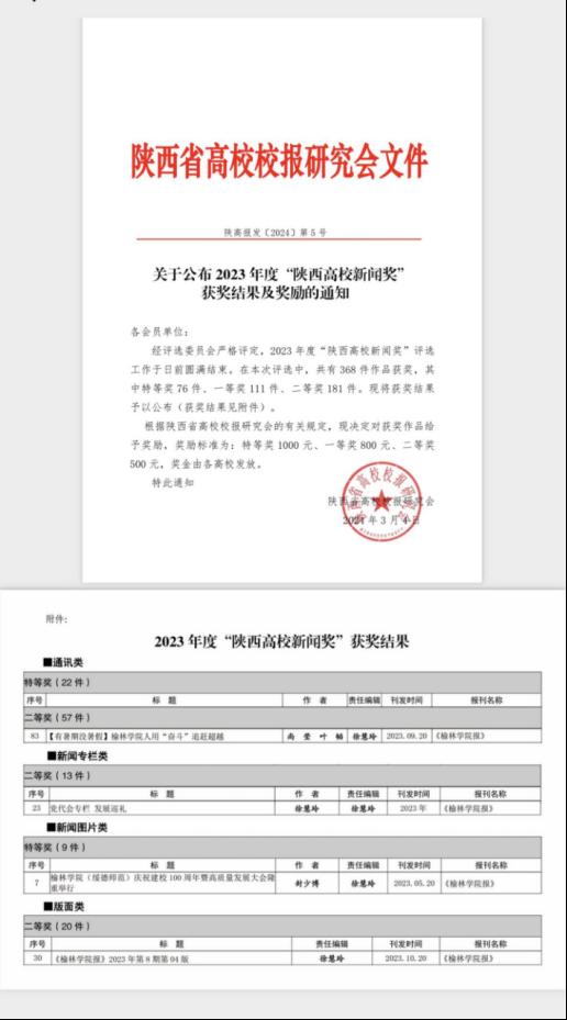 近日,陕西省高校校报研究会公布了2023年度“陕西高校新闻奖”评选结果,万象城allwincity官方网站入口推荐的4件作品获奖。其中特等奖1件,二等奖3件。封少博拍摄的“万象城allwincity官方网站入口(绥德师范)庆祝建校100周年暨高质量发展大会”图片获新闻图片类特等奖;尚莹、叶韬撰写的《万象城allwincity官方网站入口人用“奋斗”追赶超越》获通讯类二等奖;徐慧玲编辑的《党代会专栏•发展巡礼》获新闻专栏类二等奖;徐慧玲编辑的《万象城allwincity官方网站入口报》2023年第八期第四版获版面类二等奖。