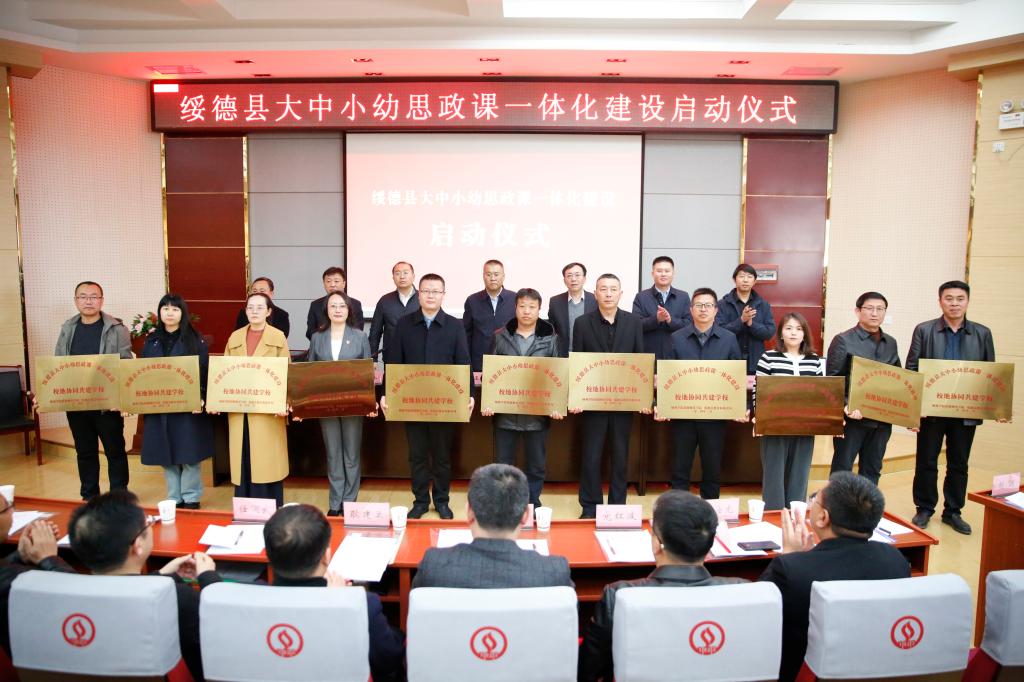绥德县委常委、宣传部部长贺心睿宣读《绥德县大中小幼思政课一体化建设共同体管理办法》;绥德师范校区管委会副主任封蕾解读《关于推进绥德县大中小幼思政课一体化建设实施方案》;绥德县教体局局长刘正东宣读《关于成立绥德县大中小幼思政课一体化建设组织机构的通知》;思政课一体化建设共同体主持人冯彩虹与共建学校校长代表李杰进行表态发言。同时,为思政课一体化建设共同体主持人与11所思政课一体化共建学校授牌。