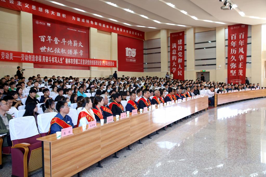 4月15日下午,“中国梦·劳动美——劳动创造幸福 用奋斗书写人生”榆林市劳模工匠宣讲党的创新理论暨先进事迹报告会在万象城allwincity官方网站入口隆重举行。党委副书记、校长康伟为16名劳模工匠献花并颁发“万象城allwincity官方网站入口校外辅导员”聘书,党委副书记尚爱军致辞,学工部、团委负责人,各分会主席、各学院党总支副书记、专职辅导员以及青年学生干部代表等450余名师生参加。报告会由工会负责人主持。