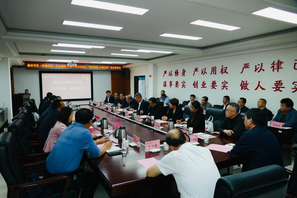 校党委副书记、校长康伟介绍学校发展情况,党委副书记尚爱军出席,副校长闫龙主持。榆林市人大常委会副主任常少海,榆林市政协副主席拓耀飞,榆林市委宣传部副部长、文明办主任张九平,榆林传媒中心副主任贺引忠,榆林传媒中心总工程师、工会主席张文斌,榆林市司法局党组成员、政治部主任孙文栋,榆林市医保局副局长刘小艺,榆林市城市管理执法局副局长黄波,榆林市市机关事务中心副主任丁利年,榆林市妇女联合会党组成员、副主席姬锦玲,榆林市农业技术服务中心党委书记李军,榆林市统计研究所所长李妮娜,榆林市实验中学校长韩波,神东天隆集团股份有限公司党群工作部部长王炜,陕西天丰昌健康产业集团有限公司董事长杨玉强,陕西秦丰酒管家商贸有限公司董事长秦利军等杰出校友受邀回校参加。