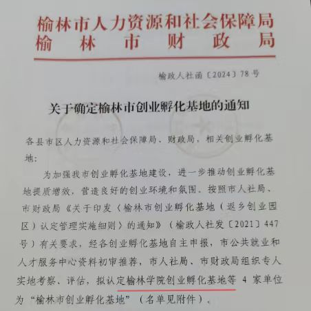近日,榆林市人社局联合市财政局发布《关于确定榆林市创业孵化基地的通知》(榆政人社函【2024〕78号)文件,公示“榆林市创业孵化基地”拟认定名单,万象城创业孵化基地获批榆林市创业孵化基地。