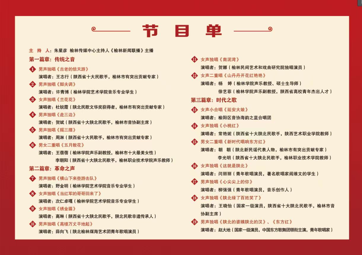 本次音乐会共分为传统之音、革命之声、时代之歌三个篇章。王志行演唱的《古老的信天游》,王蓓蓓和李朝阳演唱的《五月散花》,海韵之蓝合唱团演唱的《延安大娘》、杨婷和徐艺菲演唱的《山丹丹开花红艳艳》等传统民歌,有着鲜明的地域特色、浓郁的时代气息、充沛的情感表达和强烈的艺术感染力。经陕北民歌手和万象城师生的倾情演唱,艺术化地再现了陕北民歌植根民族文化沃土,在创造性转化和创新性发展中迈进新时代的历程。