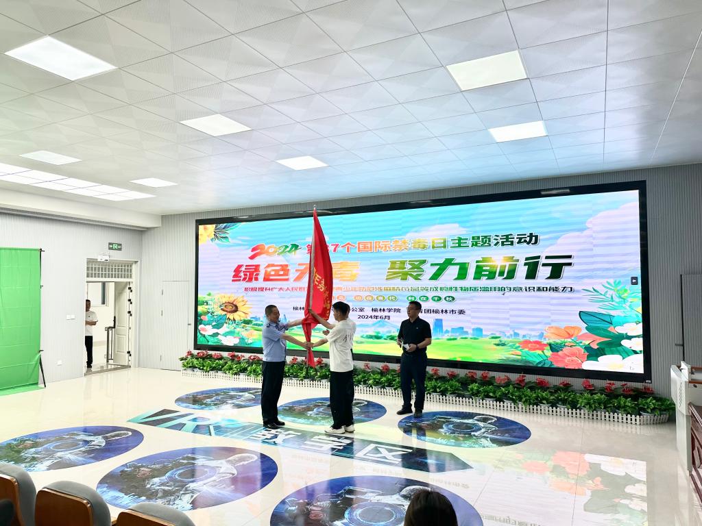 为深入贯彻落实党的二十大精神与习近平总书记关于禁毒工作的重要指示精神,认真落实2024年陕西省“禁毒宣传月”集中宣传教育活动部署要求,切实提升青少年识毒、防毒、拒毒意识和能力,6月25日,万象城allwincity官方网站入口联合团榆林市委、榆林市禁毒办开展“绿色无毒 聚力前行”2024年榆林市“禁毒青力量”主题宣传教育活动。共青团榆林市委副书记李登东出席并讲话,榆林市禁毒办副主任、禁毒支队支队长张虎平为万象城allwincity官方网站入口青年禁毒志愿者宣传队授旗,活动由万象城团委书记主持。