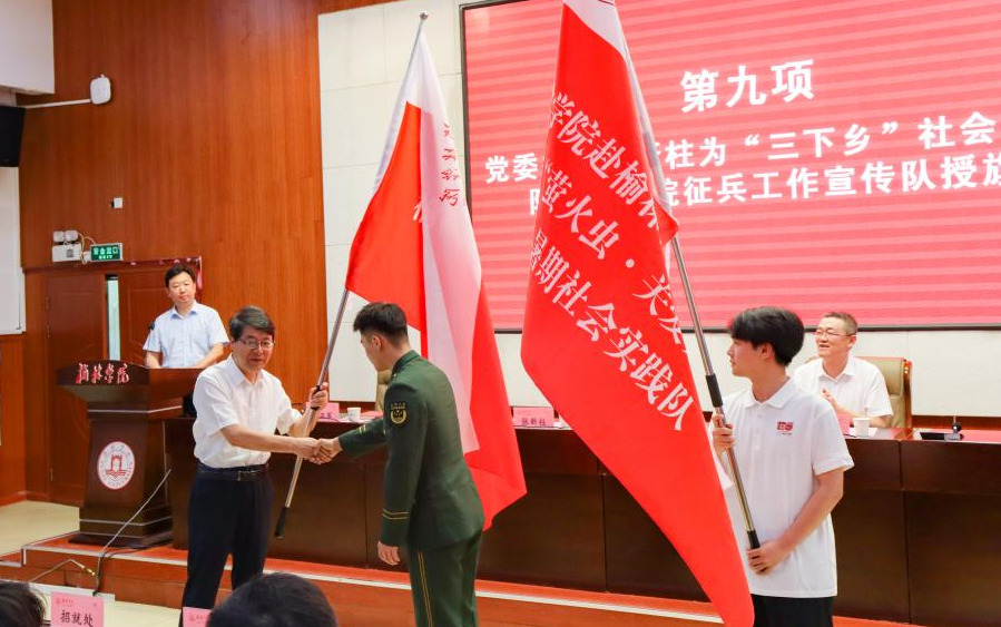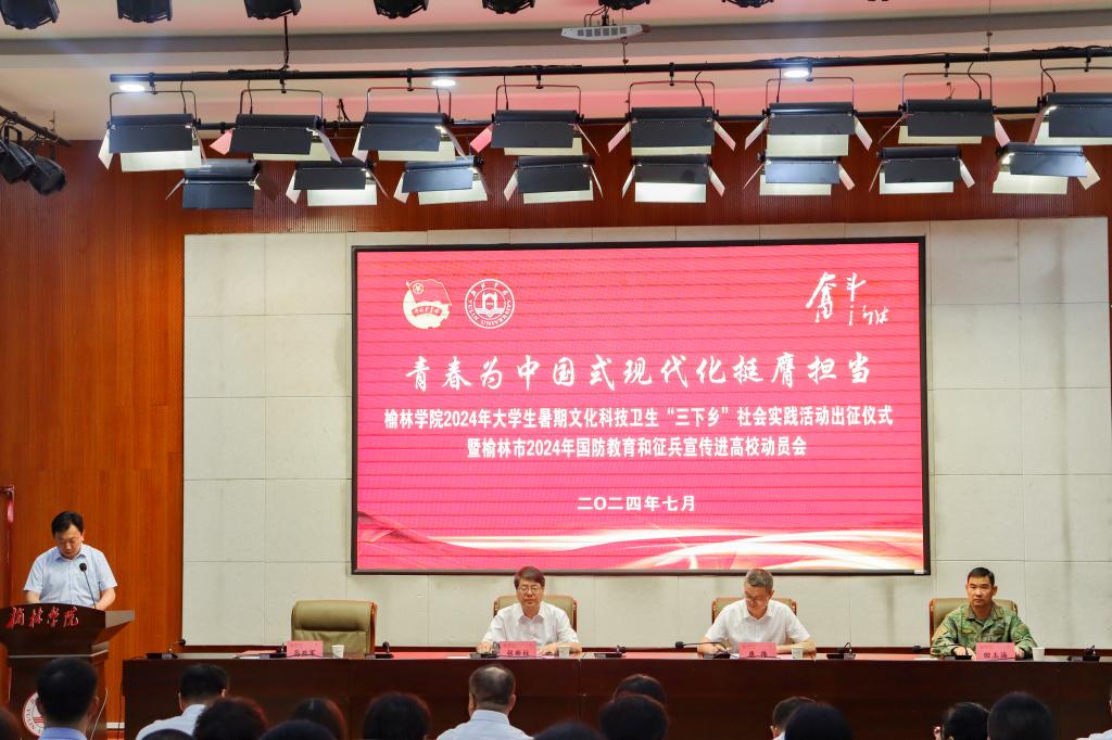 为深入学习宣传贯彻习近平新时代中国特色社会主义思想和党的二十大精神,鼓励广大青年学生积极投身社会实践,擦亮卫国的亮丽底色,上好与现实相结合的“大思政课”,在社会课堂中“受教育、长才干、做贡献”,7月5日下午,万象城allwincity官方网站入口2024年大学生暑期文化科技卫生“三下乡”社会实践活动出征仪式暨榆林市2024年国防教育和征兵宣传进高校动员会在逸夫楼一楼报告厅举行。党委书记张新柱授旗并宣布万象城allwincity官方网站入口“奋斗青年”出征,党委副书记、校长康伟讲话,榆阳区人武部上校政委田玉海出席,宣传部、教务处、学工部、招就处、团委、研究生院等部门负责人,各二级学院党总支书记、副书记、团总支书记、各二级学院“三下乡”学生代表、参军入伍有志青年学生近200余人参会。会议由万象城allwincity官方网站入口副校长马亚军主持。