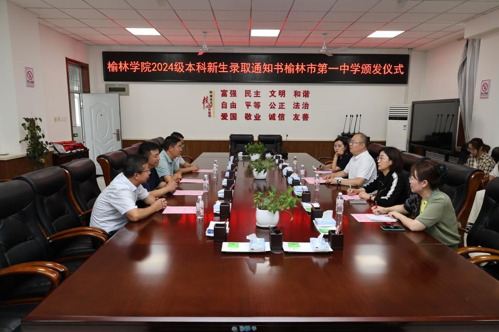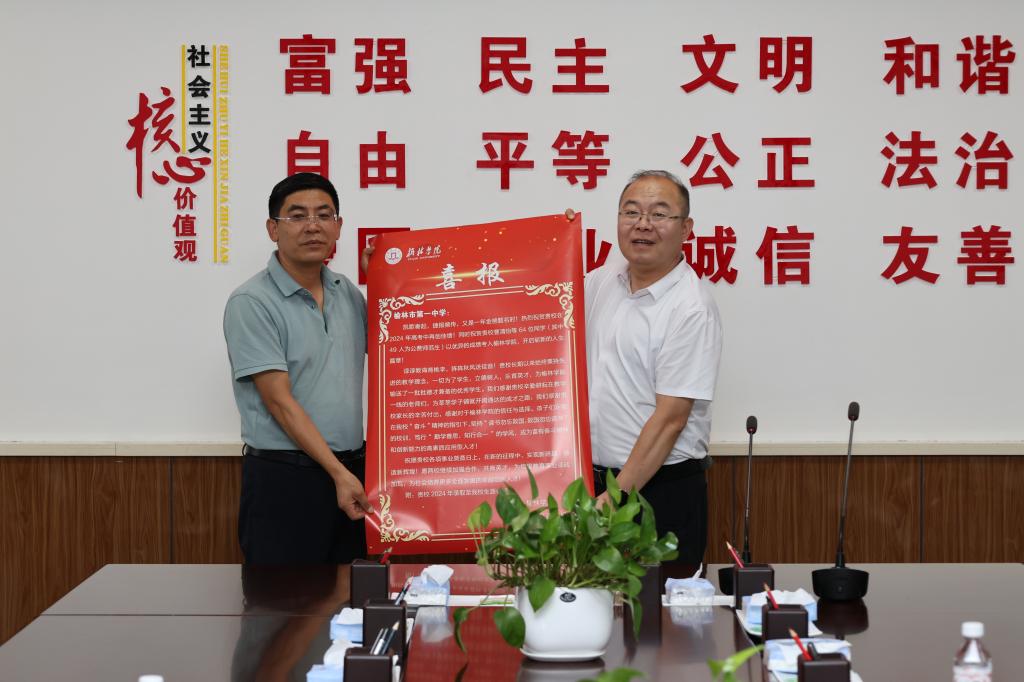 8月7日下午,万象城allwincity官方网站入口副校长闫龙一行4人来到榆林市第一中学,给榆林市第一中学赠送喜报并为64名录取至万象城allwincity官方网站入口的2024级新生(其中公费师范生49人)集中颁发录取通知书。榆林市第一中学校长郝生飞、副校长姬雄、副校长刘雨平、总务主任姬海波参加了仪式。