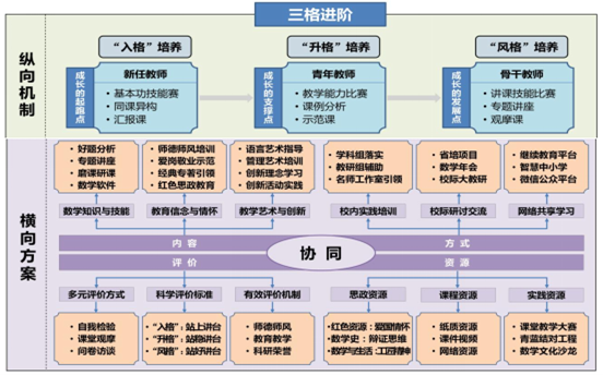 针对中学数学教师在职业生涯不同阶段的成长需求,基于MKT(面向教学的数学知识)理论,构建了“三格进阶”纵向培优机制,即新任教师(入格)培训,推行“青蓝工程”;青年教师(升格)培训,实行“菁英工程”;骨干教师(风格)培训,实施“名师工程”。对应确立“提高教学技能站稳讲台、锤炼教学策略站好讲台、提炼教学主张成就讲台”循序培养目标。通过优化内容、丰富方式、共建资源和增强评价的“四维协同”横向实施方案,纵向提升、横向培养,实效促进高中数学教师专业成长。