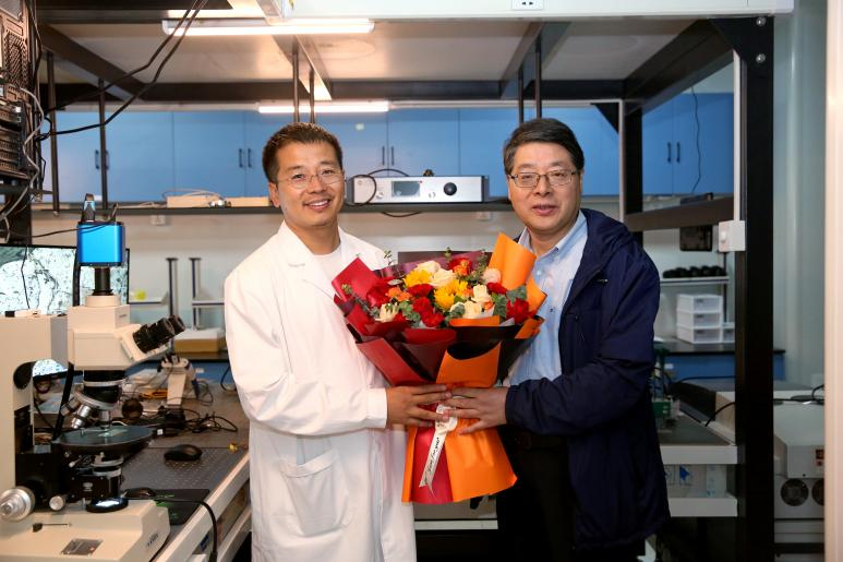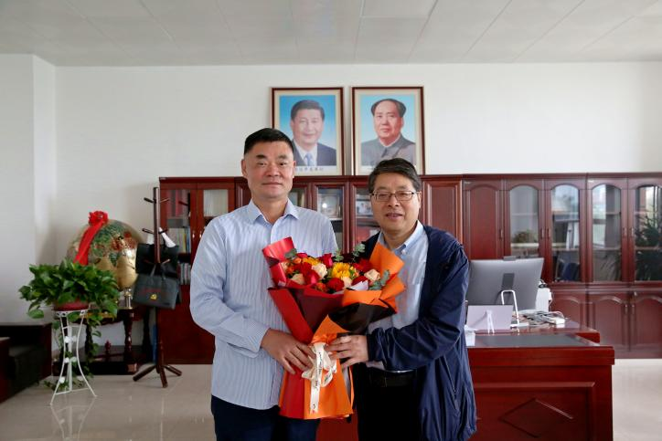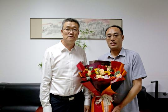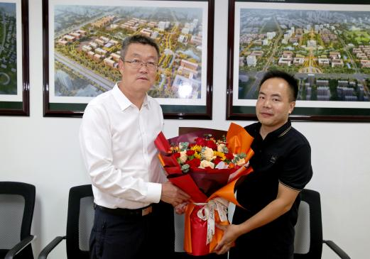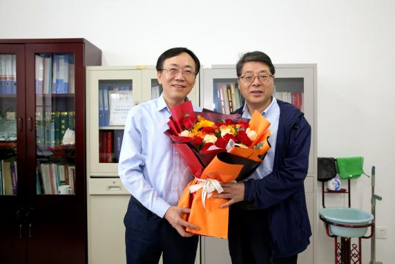 在能源工程学院实验室,张新柱向“中国国际互联网+大赛国赛铜奖”指导教师任立庆送上节日祝福。充分肯定了任立庆副教授在科技创新与指导学生竞赛方面所取得的可喜成绩,希望他继续攻坚克难,持续奋进,利用创新创业教育资源,大力推动产教研深度融合。
