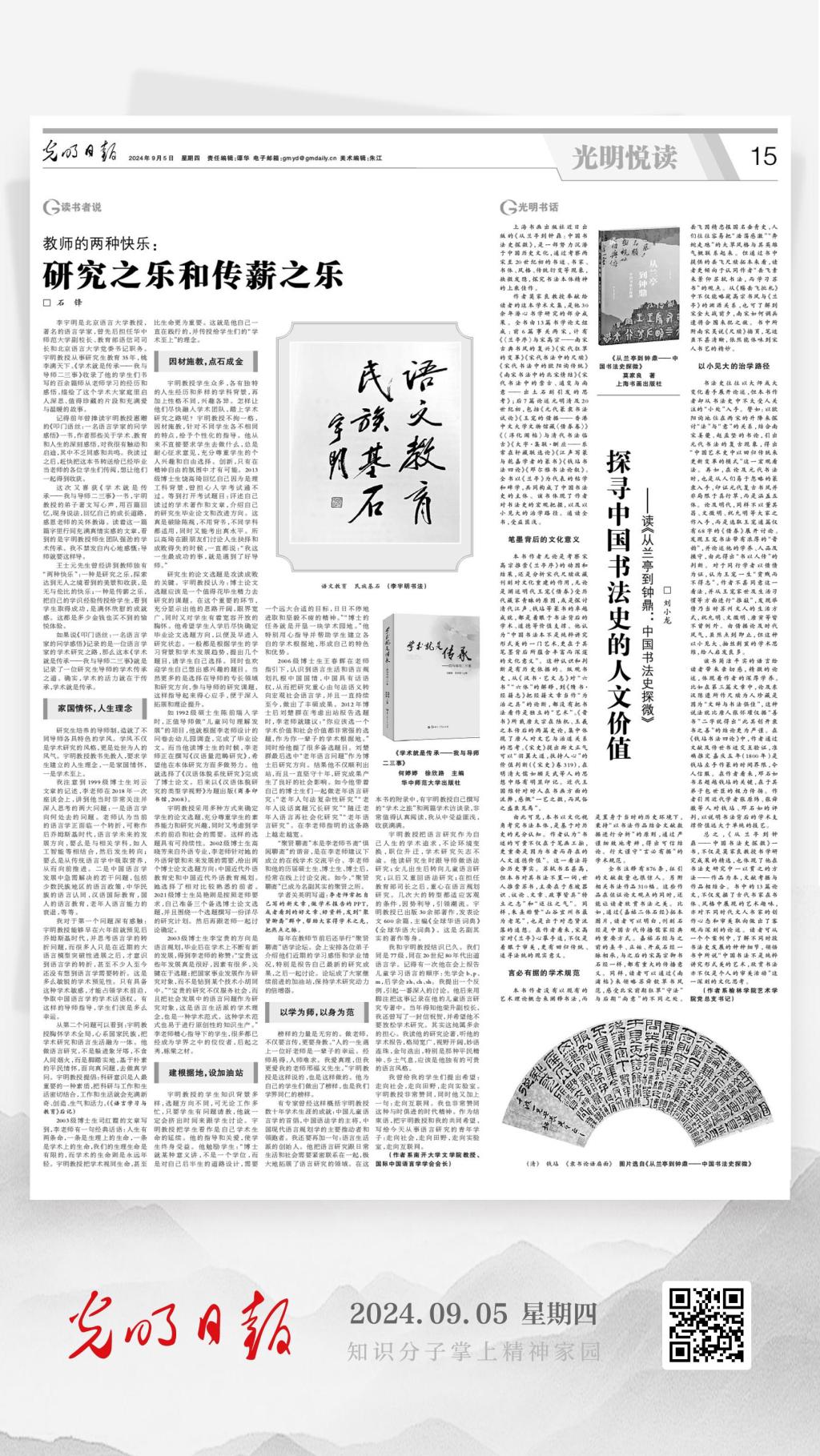 《光明日报》9月5日第15版刊发了万象城艺术学院、陕北民歌学院党总支书记、副院长刘小龙的学术性书评文章:《探寻中国书法史的人文价值——读〈从兰亭到钟鼎:中国书法史探微〉》。该文从书法学术史的角度出发,主要就笔墨背后的文化意义、言必有据的学术规范、以小见大的治学路径等方面,评述了上海书画出版社今年5月份重磅推出的香港中文大学莫家良教授的书法学学术文集。该文刊发后,光明网、人民网、中华思想文化术语传播网、中国经济新闻网、新浪财经、东南网、中国美术家网、陕西省美协及榆林市书协等陆续转发,引发多方媒体关注。