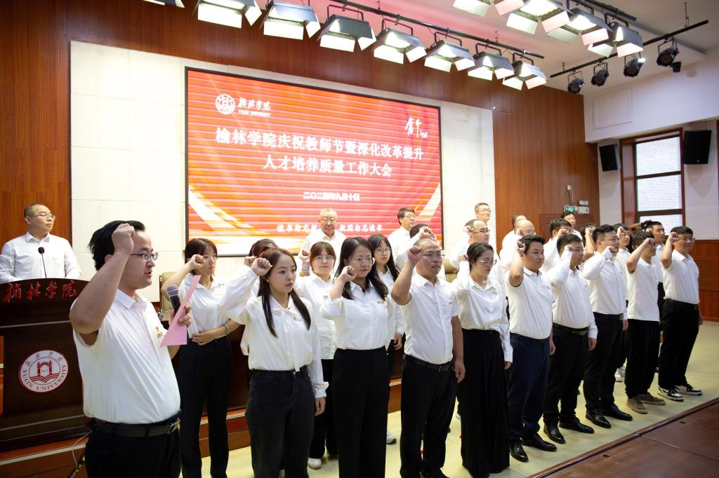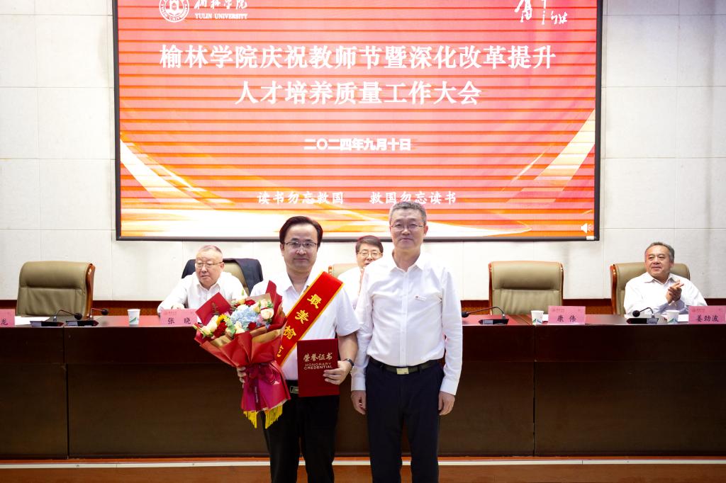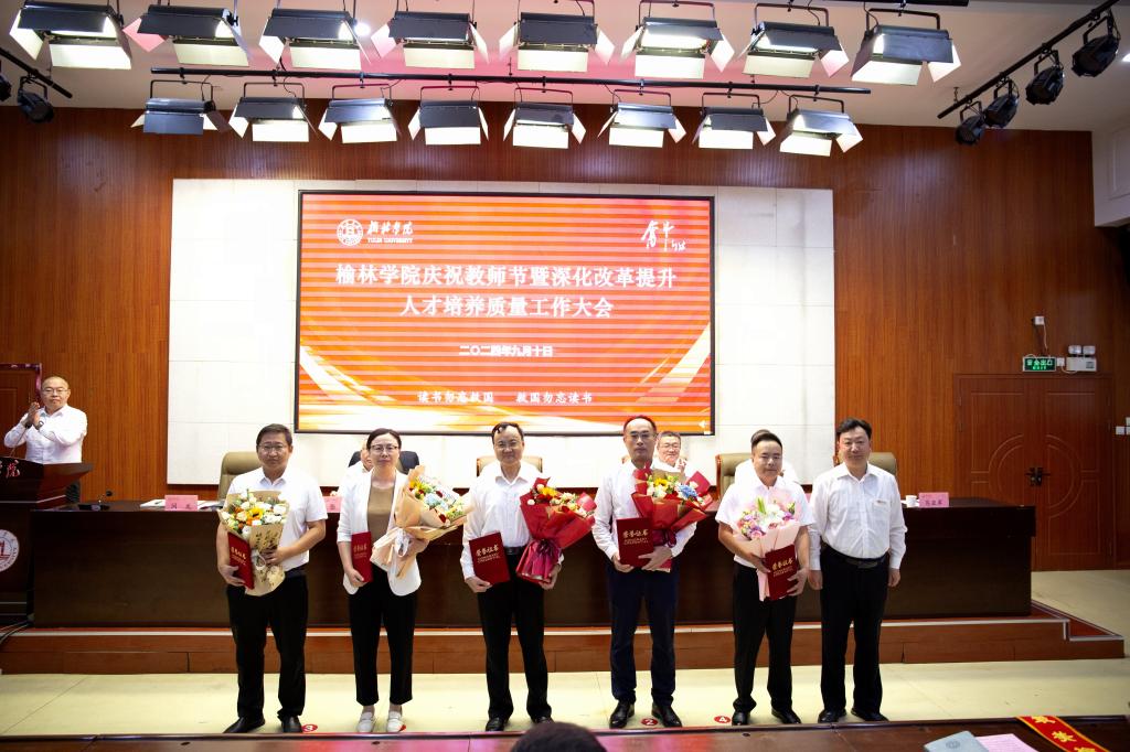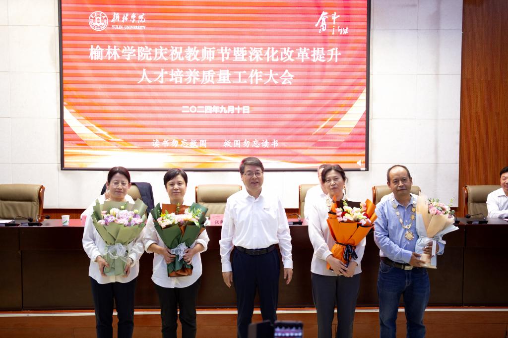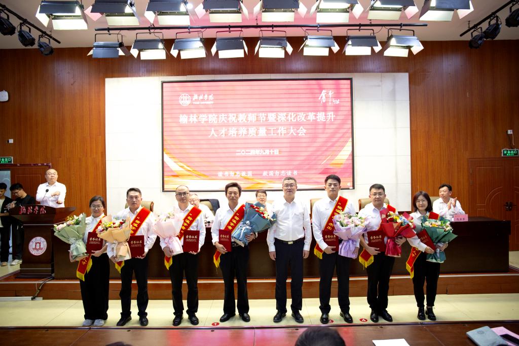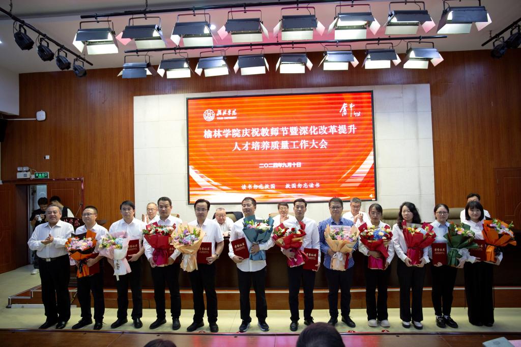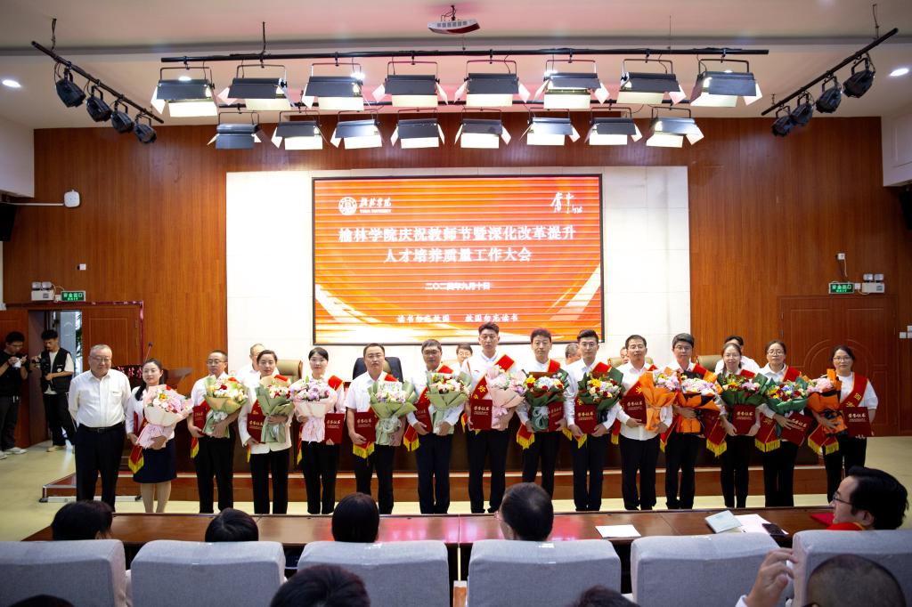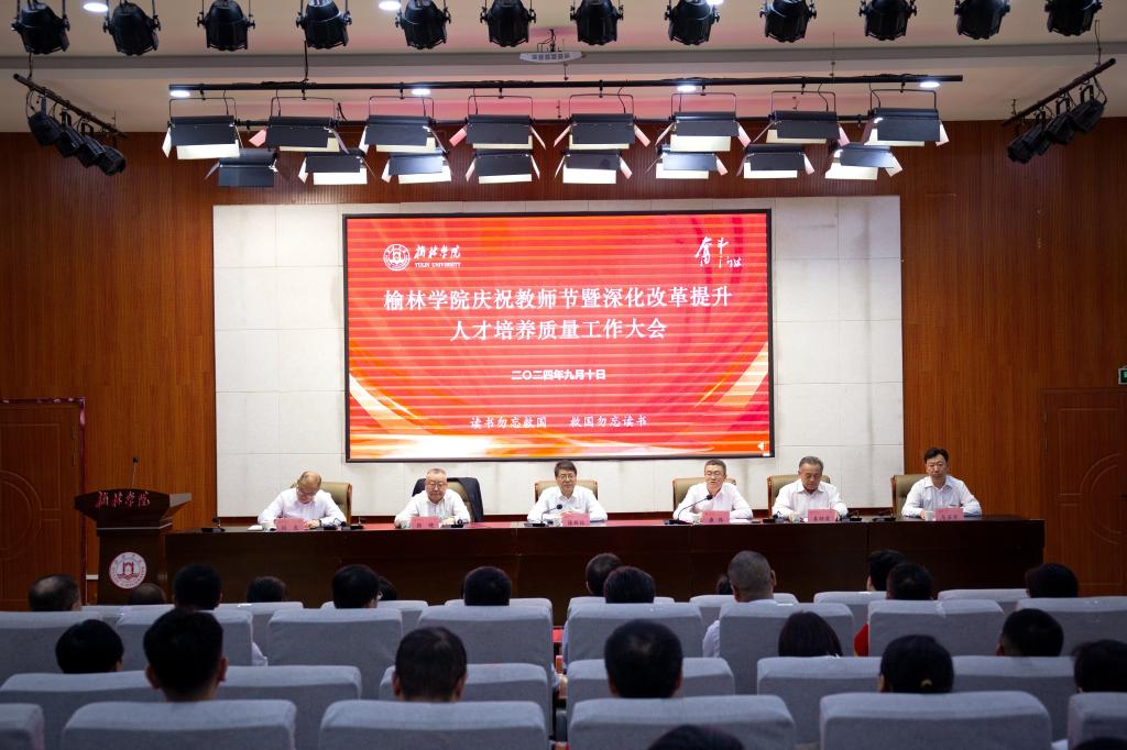 为深入学习贯彻党的二十届三中全会和全国教育大会精神、习近平总书记关于教育的重要论述和中共中央、国务院关于弘扬教育家精神加强新时代高素质专业化教师队伍建设的意见,进一步深化改革,全面提高人才培养质量,9月10日下午,以“大力弘扬教育家精神、深化改革提升人才培养质量”为主题的万象城allwincity官方网站入口庆祝教师节暨深化改革提升人才培养质量工作大会在逸夫楼一楼报告厅隆重举行。全体校领导、副处级及以上干部、三级教授、从教30年教师、入选2024年全国优秀教师、2024年“最美榆苑人”“四有好老师”“榆溪学者”、2024年国家自然科学基金项目获批者、陕西省基础教育教学成果奖获得者、教师代表、新进博士、学生代表近200人参加。