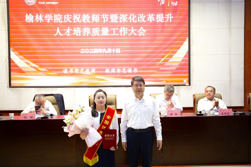 党委书记张新柱为“全国优秀教师”获得者赵慧颁奖