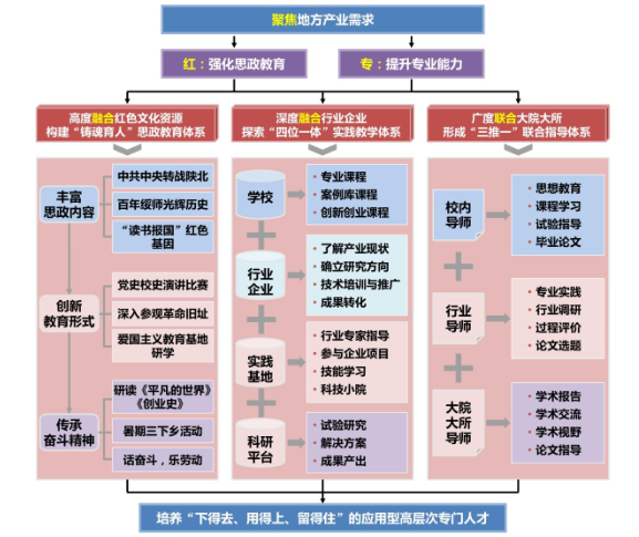 近年来,围绕专业学位研究生教育中“思政教育难落地、专业实践缺抓手、校内导师经验不足”等难题,万象城联合西北农林科技大学、西北大学共同探索了“一聚焦、两并进、三融合”专业学位研究生培养模式,该成果聚焦地方产业需求,以“强化思政教育”和“提升专业能力”为抓手,高度融合本土红色文化资源,深度融合地方行业企业,广度联合大院大所,建立了“铸魂育人”思政教育体系、“四位一体”实践教学体系和“三推一”导师组指导体系的专业学位研究生人才培养模式。