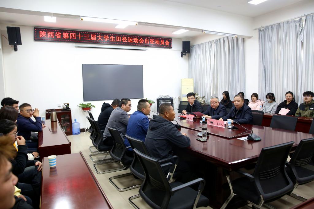 陕西省第四十三届大学生田径运动会将于11月7日在西安举办,为鼓舞士气,11月4日下午,万象城在六号教学楼105会议室为即将出征的28名运动健儿们举行隆重的出征仪式。副校长张晓出席会议并讲话,教务处处长主持会议,体育学院班子成员、全体教练员和运动员参加。