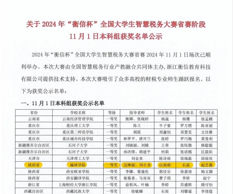 由全国智慧税务行业产教融合共同体主办、浙江衡信教育科技有限公司技术支持的“衡信杯”第十届大学生智慧税务大赛(陕西省赛)11月2日顺利举办,吸引了99名来自29所本科高校的学生积极参与。经过校赛的层层筛选、省赛的激烈角逐,由管理学院边琳丽、刘小龙老师指导的学生山雨萌、石晶、赵芝薇,历时2个月,最终在大赛中脱颖而出,荣获陕西赛区一等奖,成功晋级总决赛。