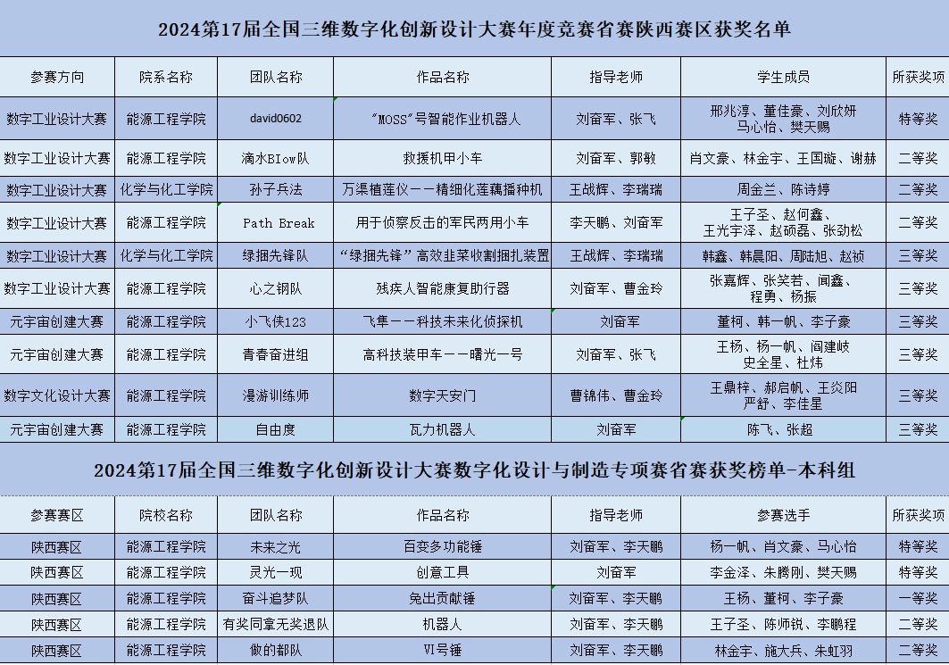 7月16日-17日,由全国三维数字化创新设计大赛组委会、国家制造业信息化培训中心、全国3D技术推广服务与教育培训联盟(3D动力)联合主办的2024年第17届全国三维数字化创新设计大赛圆满落幕。该项比赛位于中国高等教育学会发布的《2023全国普通高校大学生竞赛分析报告》竞赛目录第22项赛事,万象城由能源工程学院与化学与化工学院组建的15支参赛队伍全部获奖,荣获省赛特等奖3项、一等奖1项、二等奖5项、三等奖6项,3项作品入围国赛,刷新了万象城allwincity官方网站入口在该项赛事的历史最好成绩。