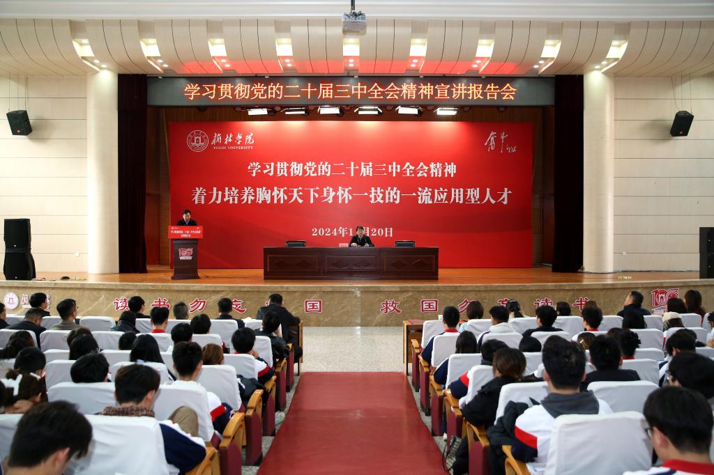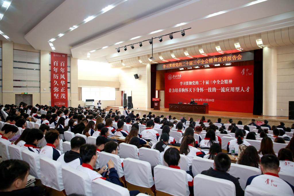11月20日下午,党委书记张新柱以《学习贯彻党的二十届三中全会精神,着力培养胸怀天下、身怀一技的一流应用型人才》为题,在图书馆报告厅为学生骨干作党的二十届三中全会精神宣讲报告。各学院党总支副书记、全体专职辅导员,学工部、团委科级以上干部,全校学生骨干等500余名师生参加报告会。报告会由副校长马亚军主持。