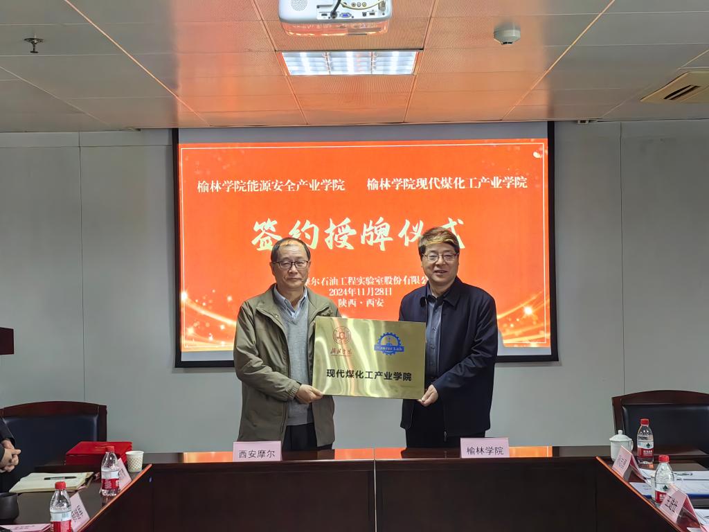 在西安摩尔石油工程实验室股份有限公司,张新柱一行在公司董事长、总经理韩勇的陪同下参观了公司,并听取了公司主要业务和重点项目介绍。座谈会由摩尔公司副总经理刘锋主持,韩勇介绍了公司的基本情况、发展历程、主营业务和人才需求等内容。能源工程学院院长王进仕和摩尔公司副总经理刘锋代表双方签订了《能源安全产业学院现代煤化工产业学院共建合作协议书》,张新柱和韩勇共同为产业学院授牌。双方就现代产业学院的高质量共建,联合人才培养、科研创新和学生就业等进行了深入交流和探讨。摩尔公司副总经理赵国仙、总经理助理薛继军、安全总监段红文、检验评价室经理尚汉青、技术服务室经理范赵斌、人事主管刘睿参加了座谈。