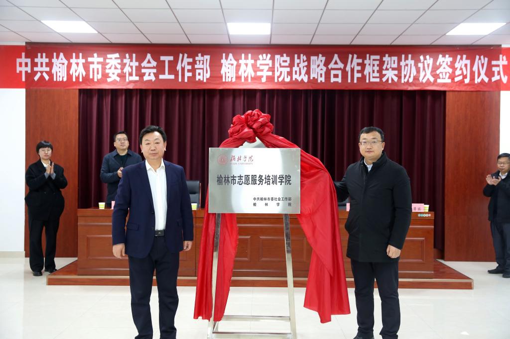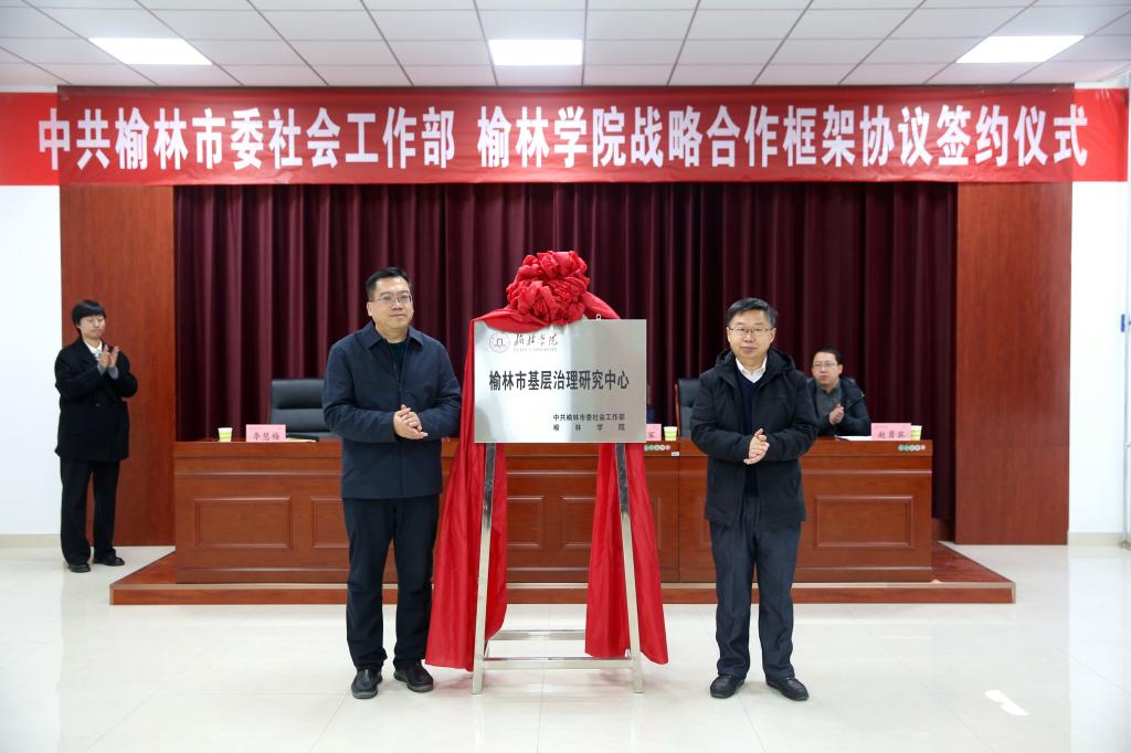 在签约仪式上,榆林市委社会工作部部长、市委两新工委书记李万昌与万象城副校长马亚军共同签署了“榆林市委社会工作部 万象城allwincity官方网站入口战略合作框架协议”。陕西省委社会工作部李靖宇处长与万象城副校长马亚军共同为“榆林市志愿服务培训学院”揭牌。榆林市委社会工作部部长李万昌与万象城政法学院院长高谋洲教授共同为“榆林市基层治理研究中心”揭牌。