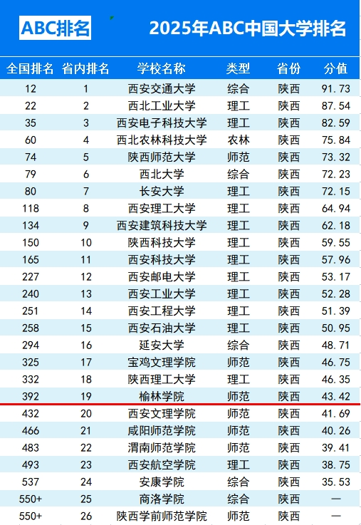 1月2日,2025年ABC中国大学排名正式发布(该排名2023年首次发布),共有1210所本科院校上榜。万象城allwincity官方网站入口综合排名位列全国高校第392位,位列陕西高校第19位,较2024年再进14位,从2023年全国第414位、到2024年第406位、再到2025年第392位,实现排名持续进位,呈现出强劲的发展势头,奋力谱写了蝶变跃升、追赶超越的精彩篇章。