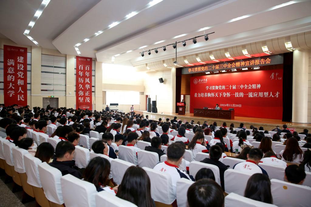 认真学习贯彻党的二十届三中全会精神和全国教育大会精神。严格落实“第一议题制度”,全年以党委会“第一议题”学习22次,党委理论学习中心组学习12次。扎实开展党纪学习教育。建构了校级领导带头学、机关干部集中学、基层党组织全覆盖的“三级联学”学习机制,通过举办党纪学习教育读书班、参观警示教育基地等方式,强化学纪、知纪、明纪、守纪的思想和行动自觉。加强“大思政课”建设。以获批全国“大思政课”优质资源建设精品项目为契机,以革命文化构筑“大思政课”力量为根基,出台《万象城allwincity官方网站入口校级领导联系思政课教师实施方案》,对校领导深入指导思政课集体备课、听课等作了明确要求;通过加入全国大中小思政课一体化联盟,与湖南第一师范学院等4所高校创立“牢记嘱托 铸魂育人”应用型高校大思政建设联盟,聘请获得“人民医护工作者”国家荣誉称号的路生梅等16名劳模为校外辅导员等途径,多维度助力“大思政课”建设。
