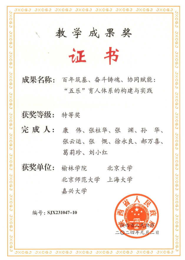 学校党委遵循习近平总书记培养德智体美劳全面发展的社会主义建设者和接班人的重要指示,实施新时代立德树人工程,创新构建“五乐”育人体系,推动教育范式从“教”到“学”的深层变革。全面实施“乐讲铸魂、乐读启智、乐跑强体、乐唱育美、乐劳塑品”育人工程,深度唤醒学生主体性,回归教育本质,以快乐为桥梁,以探索为路径,让学生在知行合一中拓展生命的广度与深度,培养兼具家国情怀与全球视野的全面发展的时代新人。《百年筑基、奋斗铸魂、协同赋能:“五乐”育人的体系构建与实践》荣获2023年省级教学成果特等奖;学校开展新生大思政教育“四部曲”,组织学生观看原创红色话剧《李子洲在1929》、参观百年校史馆、阅读文学经典《平凡的世界》、聆听劳模故事,帮助新生在“拔节孕穗期”扣好大学第一粒扣子,感受浓厚红色校园文化,激发爱国爱校热情与奋斗精神;依托“西北革命策源地研究中心”“红色文化传承与应用研究中心”两个平台,开展地方红色文化基础理论、宣传教育、人才培养、传承发展等方面的研究和实践工作;依托“中国李大钊研究会教研基地”“北京大学思想政治实践课教育基地”等育人基地,与中国李大钊研究会、北京大学等全国兄弟院校和相关单位建立战略合作关系,育人资源共建共享,以“大思政”课书写榆林红色文化资源育人新篇章;“青年马克思主义理论学社” 成立于2009年,十五年间风雨兼程、砥砺前行,在学校立德树人工作大局中发光发热,微小的力量汇聚成了磅礴洪流;毛泽东调查研究思想读书小组获评中国高等教育学会马克思主义研究分会“马克思主义经典著作研读”资助计划优秀读书小组;《地方高校“一聚焦、两并进、三融合”专业学位研究生培养模式探索与实践》获陕西省高等教育教学成果奖(研究生)二等奖;思政专业本科生荣获“全国互联网+”大学生创业创新大赛金奖,全国微课大赛特等奖,第十届“田家炳杯”全国师范院校教学技能竞赛二等奖,师范生技能大赛省级奖项等。