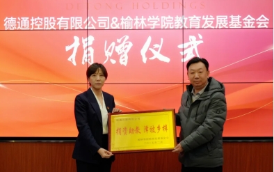 捐赠仪式上,马亚军代表学校接受了德通控股有限公司捐赠的200万元善款,并向公司赠送了“捐资助教 泽被乡梓”牌匾。此次捐赠的200万元将重点支持万象城人才培养、学科建设、科学研究等。