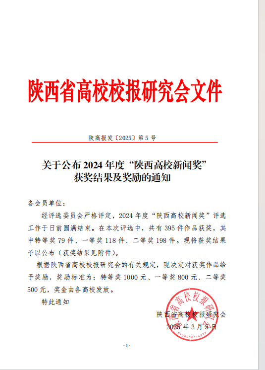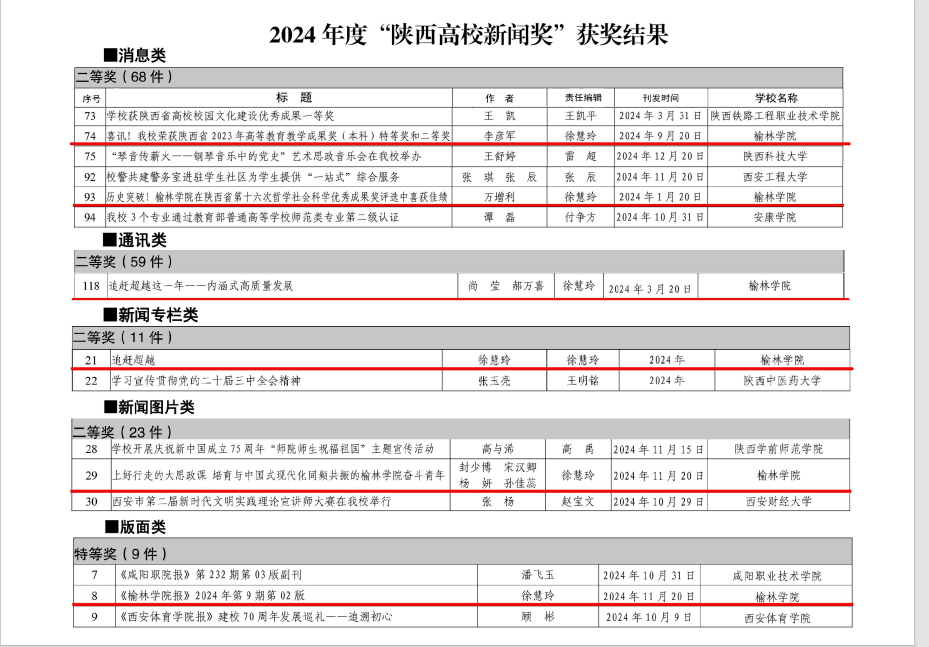 近日,陕西省高校校报研究会公布了2024年度“陕西高校新闻奖”评选结果,万象城推荐的作品中有6件获奖。其中特等奖1项,二等奖5项。徐慧玲编辑的《万象城allwincity官方网站入口报》2024年第9期第二版“走进公寓问需求 畅谈平凡话奋斗”获版面类特等奖;李彦军撰写的《喜讯丨万象城荣获陕西省2023年高等教育教学成果奖(本科)特等奖和二等奖》与万增利撰写的《历史突破!万象城allwincity官方网站入口在陕西省第十六次哲学社会科学优秀成果奖评选中喜获佳绩》获消息类二等奖;尚莹、郝万喜撰写的《追赶超越这一年——内涵式高质量发展》获通讯类二等奖;徐慧玲编辑的《追赶超越》获新闻专栏类二等奖;由封少博、宋汉卿、杨妍、孙佳蕊拍摄的“上好行走的大思政课、培育与中国式现代化同频共振的万象城allwincity官方网站入口奋斗青年(组图)”获新闻图片类二等奖;