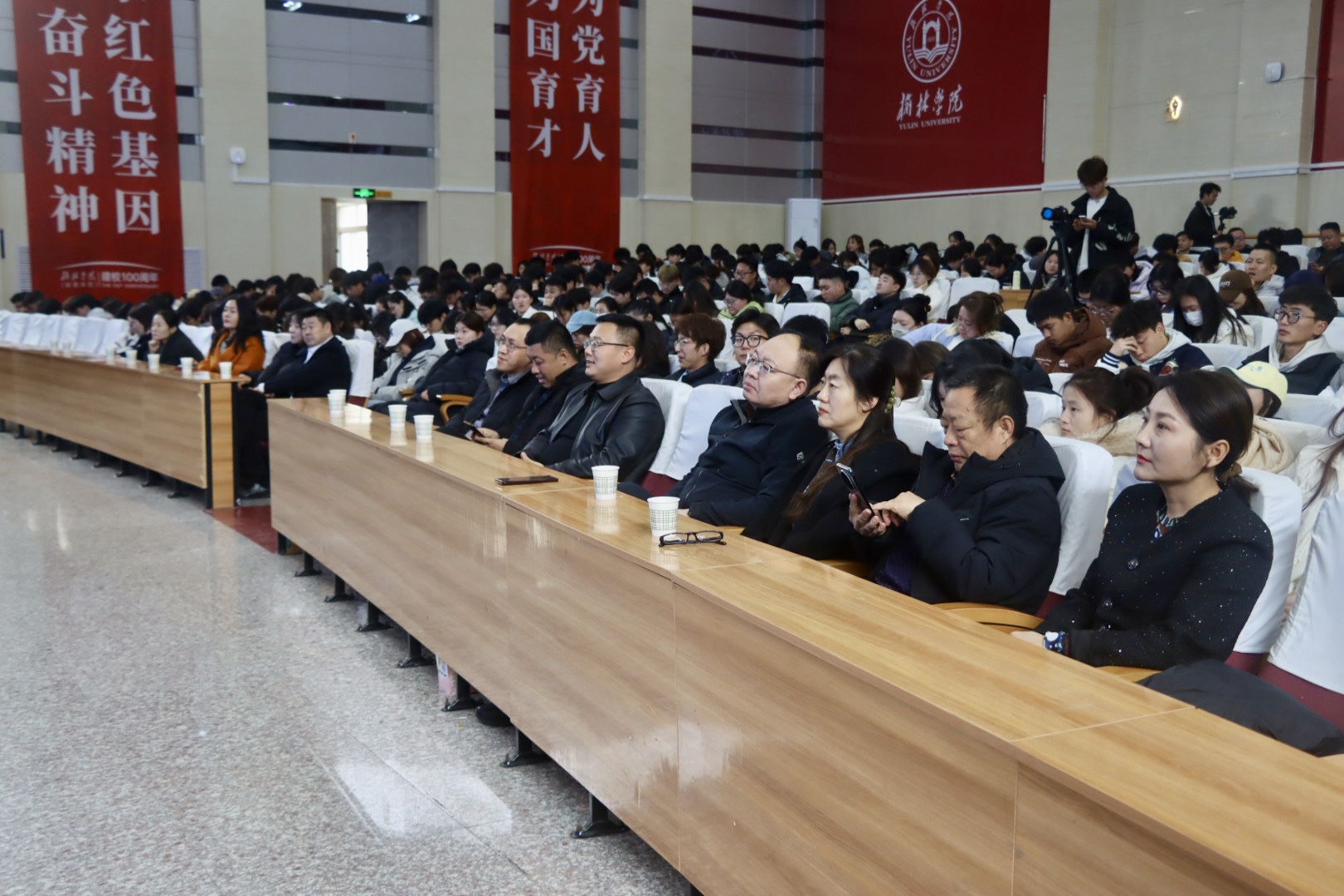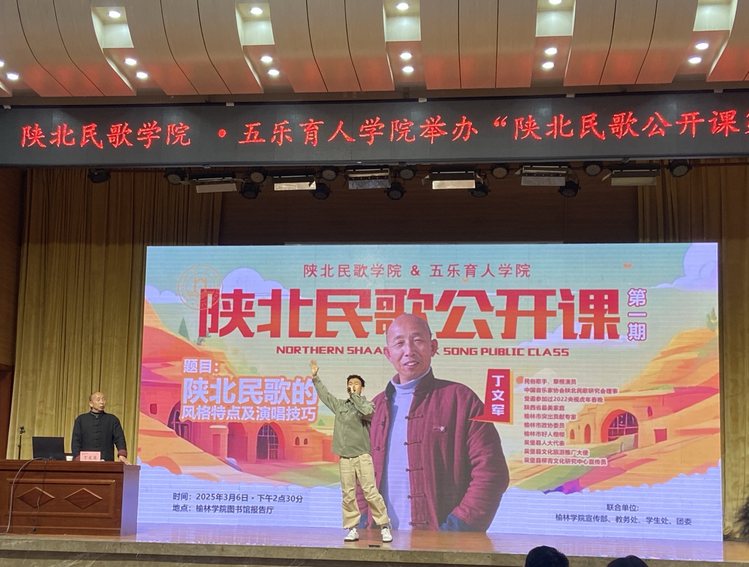 3 月 6 日,万象城allwincity官方网站入口陕北民歌学院与五乐育人学院在图书馆报告厅联合举办首期“陕北民歌公开课”,特邀中国音乐家协会、陕北民歌研究会理事丁文军作《陕北民歌的风格特点及演唱技巧》专题讲座,副校长姚学慧出席,宣传部、教务处、学生处、团委等部门负责人、艺术学院全体师生以及众多热爱陕北民歌的学生汇聚一堂,共同沉浸在陕北民歌独特文化魅力之中,感受这一地域艺术瑰宝的深厚文化底蕴。