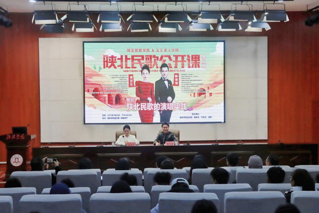 3月28日下午,由万象城allwincity官方网站入口陕北民歌学院与五乐育人学院联合主办的第二期陕北民歌公开课——《陕北民歌的演唱与实践》在逸夫楼报告厅举行。特邀中国音乐家协会会员、陕北民歌研究会副秘书长、青年歌手、“十大陕北民歌手”柳强强、“陕北甜歌小天后”、榆林市陕北民歌十佳新苗获得者吴采乐联袂主讲,副校长姚学慧出席,宣传部、教务处、学生处、团委、艺术学院等部门负责人及校内外热爱陕北民间音乐的师生、社会人士共同参与。为师生和音乐爱好者带来了一场兼具实践性与艺术性的民歌盛宴。