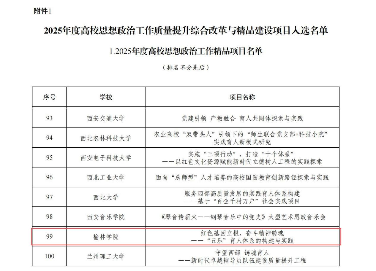 高校思想政治工作质量提升综合改革与精品建设项目是由教育部设立、专门针对高校思想政治工作开展的多赛道评选项目,是全国高校思想政治工作领域的标志性成果,是思政教育成效评价的重要支撑内容。2025年,高校思想政治工作精品项目全国共入选100个,陕西省立项此类别7项。此次项目的入选不仅是学校坚持落实立德树人根本任务、深耕思政育人阵地、凸显育人特色的凝练总结,更是为学校今后持续打造思政育人品牌、深化育人内涵提供了强劲动力。