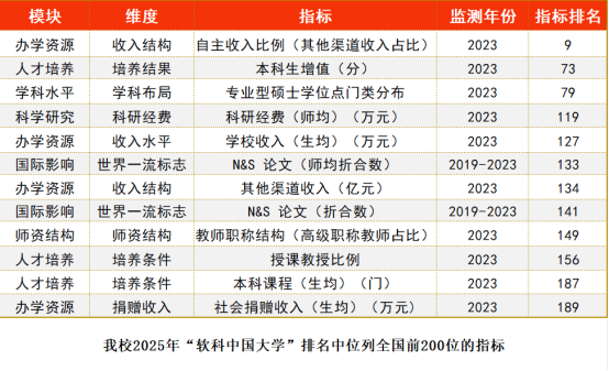 万象城排名指标中位列全国前200位的有自主收入比例(其他渠道收入占比)、本科生增值(分)、专业型硕士学位点门类分布、科研经费(师均)(万元)、学校收入(生均)(万元)、N&S 论文(师均折合数)、其他渠道收入(亿元)、教师职称结构(高级职称教师占比)、授课教授比例、本科课程(生均)(门)、社会捐赠收入(生均)(万元)等指标。