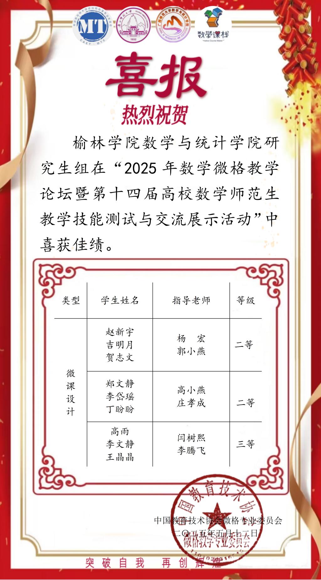 本次赛事万象城选派三支研究生代表队参赛数学微课设计能力测试赛道,最终荣获二等奖两项,三等奖一项,成绩喜人。
