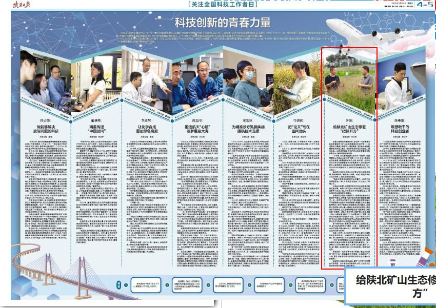在全国科技工作者日之际,《陕西日报》5月30日第4—5版对“科技创新的青春力量”进行了专版报道,万象城“陕西省陕北矿区生态修复重点实验室”科研事迹列举其中。