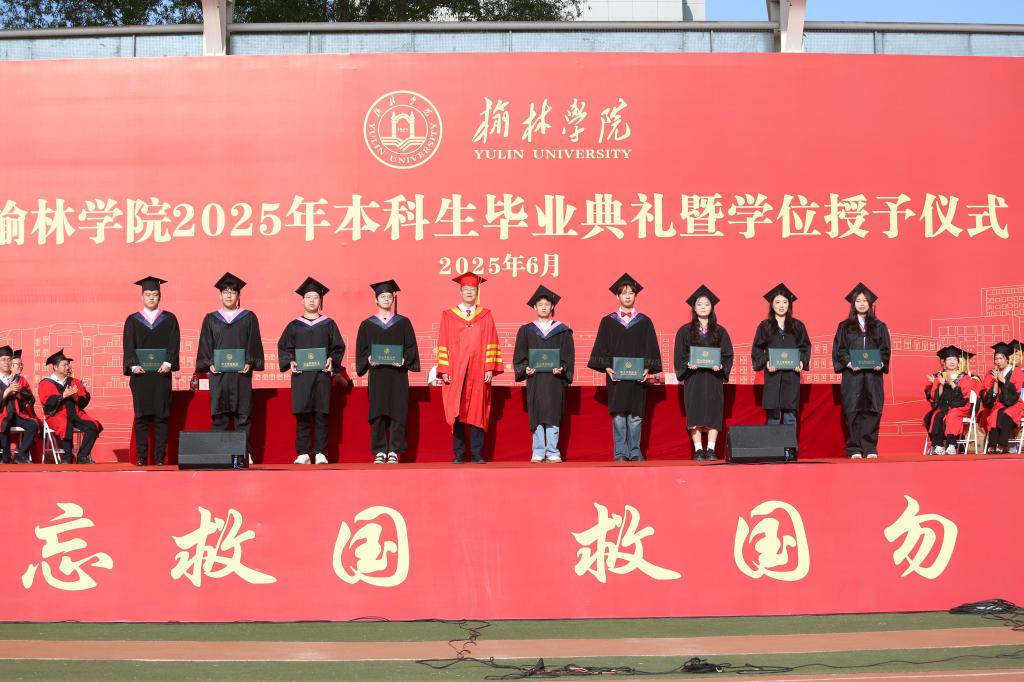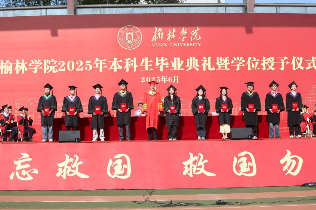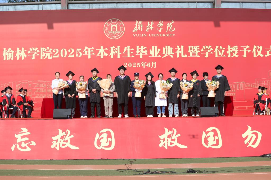 毕业典礼在雄壮嘹亮的国歌声中拉开序幕。副校长张晓宣读毕业及学位授予情况,学位委员会主席康伟校长为54名学位获得者代表逐一颁发证书并拨流苏,现场掌声此起彼伏,见证这一荣耀瞬间。党委副书记马亚军宣读122名“校级优秀本科毕业生”名单,副校长姚学慧宣读87名“校级优秀学生干部”名单,校领导为获奖代表颁发荣誉证书。典礼特别设置感恩环节,毕业生代表向公寓、安保、餐饮等一线工作人员献花,致谢他们在校园生活中润物无声的守护与付出,传递出榆苑学子的感恩之心。