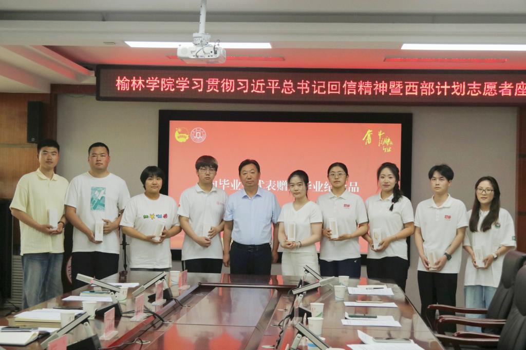 座谈会后马亚军向毕业生代表赠送纪念品并合影留念。