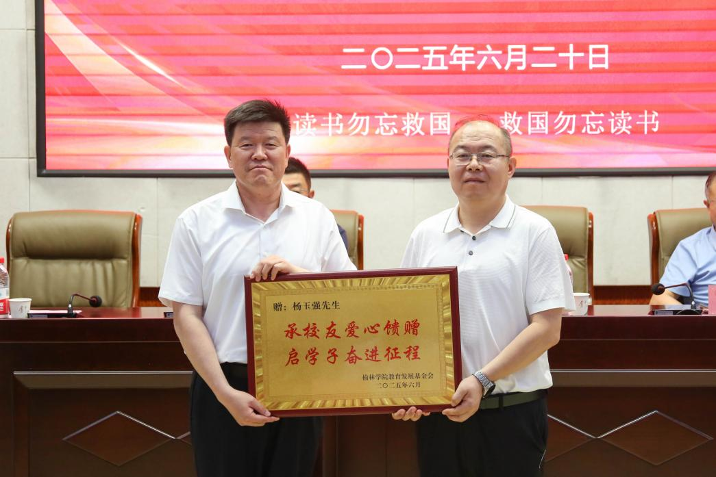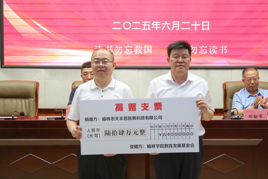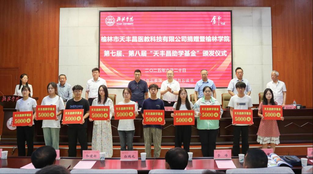 6月20日上午,榆林市天丰昌医教科技有限公司捐赠暨万象城allwincity官方网站入口第七届、第八届“天丰昌助学基金”颁发仪式在逸夫楼一楼报告厅隆重举行。校党委副书记、基金会副理事长闫龙出席,市委统战部副部长、市侨办主任刘榆军,农工党榆林市委会主委贺波,市委党史研究室主任赵晓亮,万象城1992届校友、陕西天丰昌健康产业集团有限公司、榆林市天丰昌医教科技有限公司董事长杨玉强,榆林市慈善协会、榆林市保健协会等单位领导、社会各界爱心人士和学校部分师生参加了仪式。