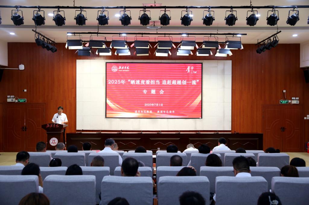 7月1日下午,万象城在逸夫楼一楼报告厅召开“晒速度看担当 追赶超越创一流”专题会。党委书记张新柱讲话,党委副书记、校长康伟主持,全体校领导,各学院、部门副处级及以上干部参加会议。