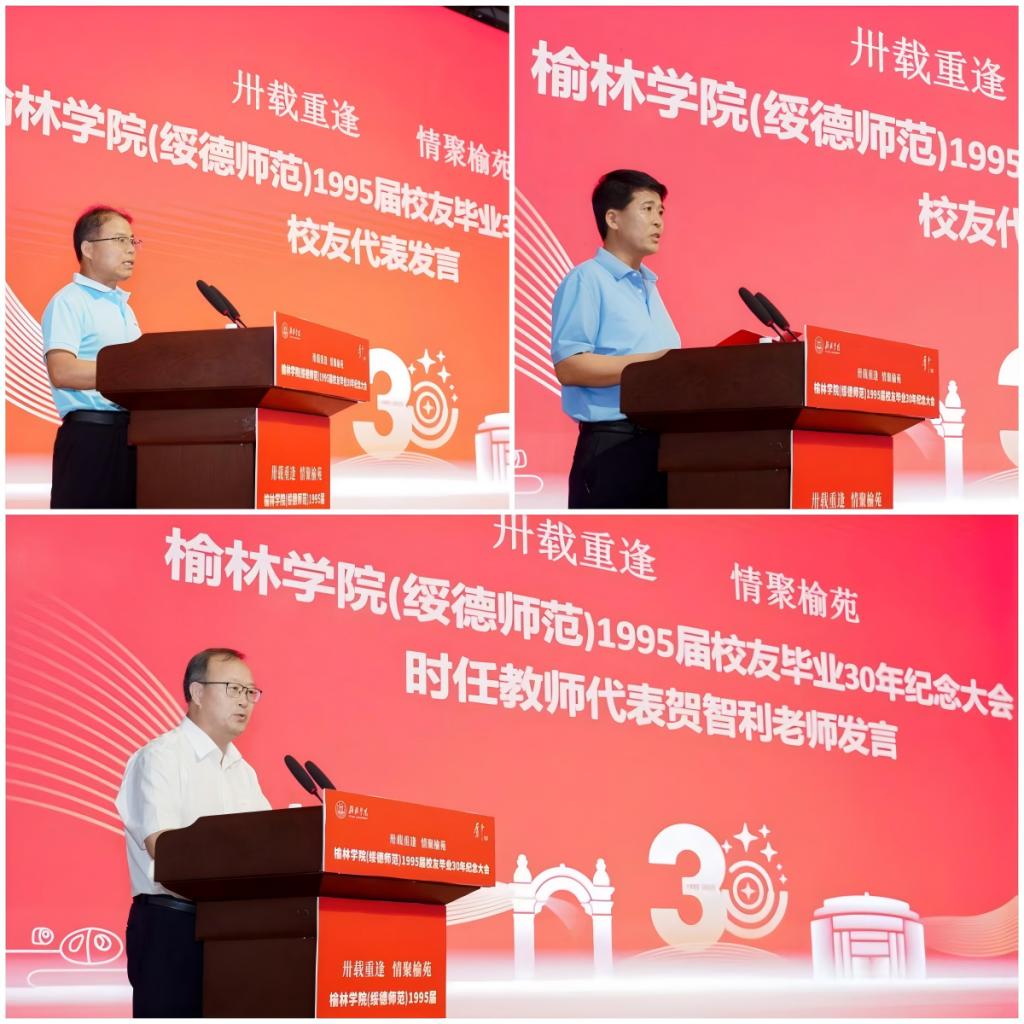 会上,广大校友和师生共同观看了《启航未来成就梦想》宣传片。通过一帧帧鲜活的画面,共同回顾与见证母校一路以来的不懈奋斗与成长担当。1992级数学教育专业校友、延安市第一中学校长助理、创新部主任、“全国模范教师”高鱼仓和1992级普师校友、子洲县人民政府副县长郭建军,作为校友代表分别发言,分享30年来的奋斗故事与人生感悟,字里行间都饱含着对母校栽培的感恩、对同窗情谊的珍视和对事业的满腔热忱。“陕西省先进工作者”、“最美榆苑人”、三级教授贺智利作为时任教师代表发言,以师者视角回望往昔教学点滴,寄语校友继续勇毅奋斗。薪火相传的师生情谊,构成了万象城allwincity官方网站入口生生不息的精神脊梁。