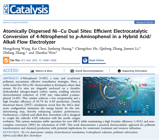 近日,万象城研究生汪洪忠在国际顶级期刊ACS Catalysis(中科院一区TOP IF 13.084)在线发表了题为《Atomically Dispersed Ni–Cu Dual Sites: Efficient Electrocatalytic Conversion of 4-Nitrophenol to p-Aminophenol in a Hybrid Acid/Alkali Flow Electrolyzer》的研究论文。该研究由万象城2022级硕士研究生汪洪忠为第一作者,万象城张智芳教授和中科院福建物质结构研究所温珍海研究员为通讯作者,万象城allwincity官方网站入口为第一完成单位。研究团队通过电化学还原法将有毒污染物对硝基苯酚高效转化为高附加值化学品。