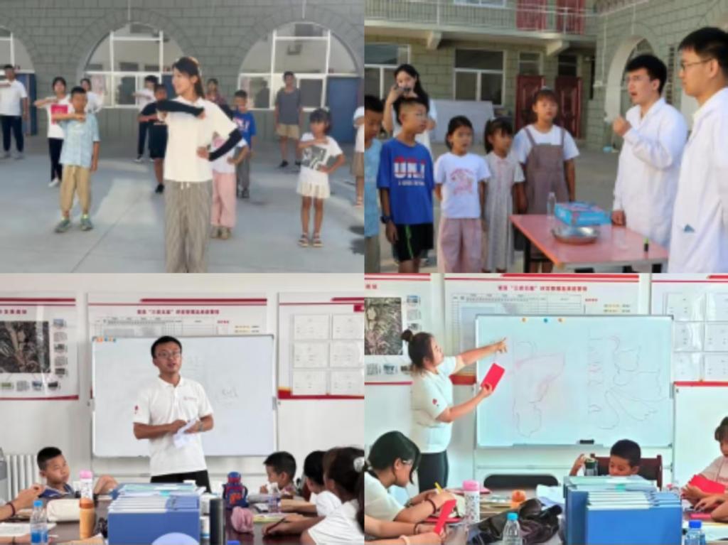 特色支教筑梦乡土,八门学科点亮课堂。针对鱼河峁镇乡村教育需求,实践团量身打造涵盖语文、数学、英语、音乐、化学实验、生物、美术、物理的8门特色课程,为20余名中小学生带来16天的“定制课堂”。志愿者们将课本知识与乡土实践深度融合:音乐课教唱《南泥湾》,让“自力更生、艰苦奋斗”的红色基因浸润童心;化学实验课上,趣味小实验点燃孩子们的科学探索欲;数学课结合田间作物计数讲解应用知识,让抽象概念变得可知可感;剪纸课上,孩子们在折纸、剪裁中触摸传统文化温度;“朗诵课老师讲《虞美人》里的故事,太有趣了!”一名学生的话语道出课堂活力。15天累计授课超100小时,不仅填补了乡村暑期教育空白,更在孩子们心中播下求知与向上的种子。
