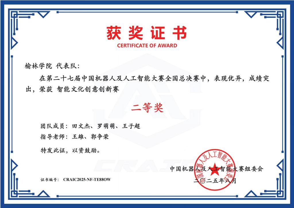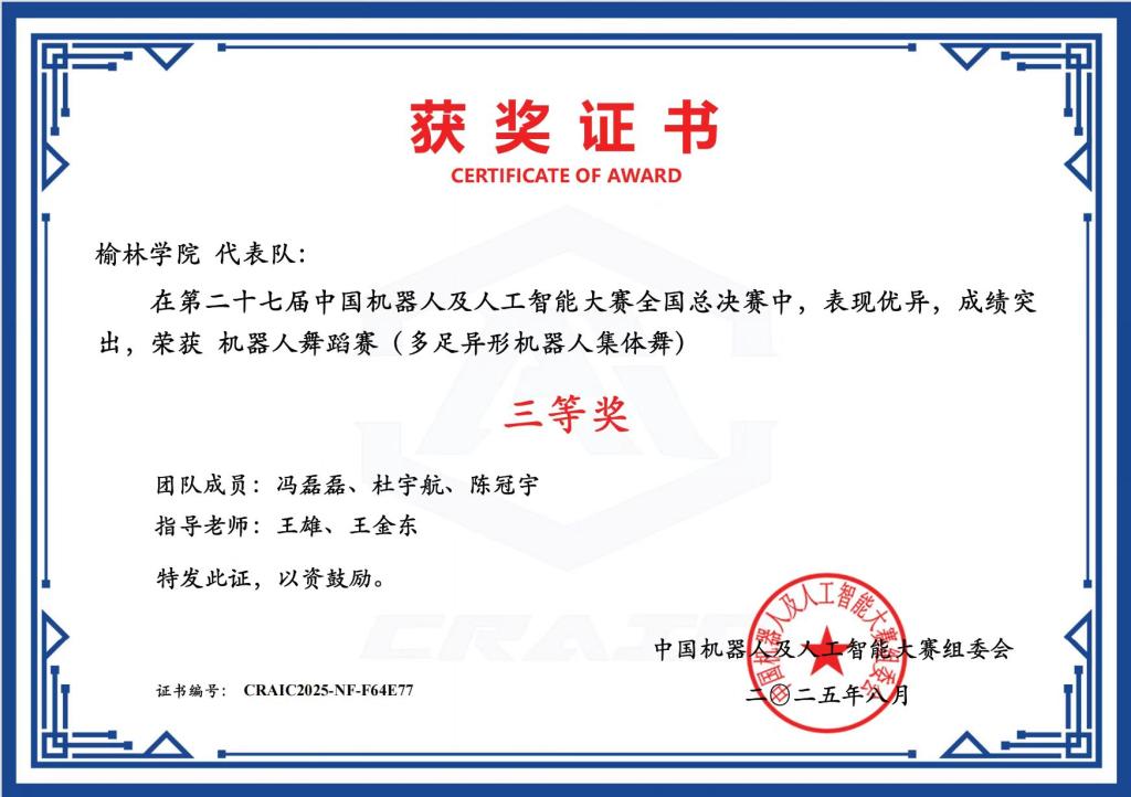 继在陕西省赛中突出重围后,万象城三支代表队在全国总决赛中持续发力。由田文杰、罗萌萌、王子超组成的团队,凭借对智能文化创新创意赛的深刻理解与精湛技术,在众多作品中脱颖而出,荣获二等奖;冯磊磊、杜宇航、陈冠宇团队则以灵动的机器人舞蹈设计,在机器人舞蹈赛中斩获三等奖;张心铭、秦凯波、田星团队在全地形协同机器人挑战赛中,凭借对复杂地形的精准应对,同样收获三等奖。