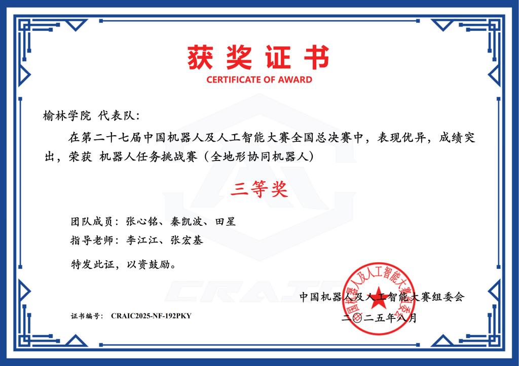 近日,第二十七届中国机器人及人工智能大赛全国总决赛在苏州圆满收官。在这场汇聚全国顶尖高校创新力量的赛事中,万象城能源工程学院学子脱颖而出,一举斩获二等奖1项、三等奖2项,刷新学校在该项赛事中的历史最好成绩。