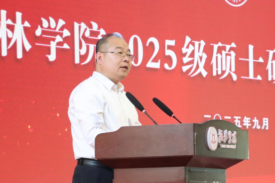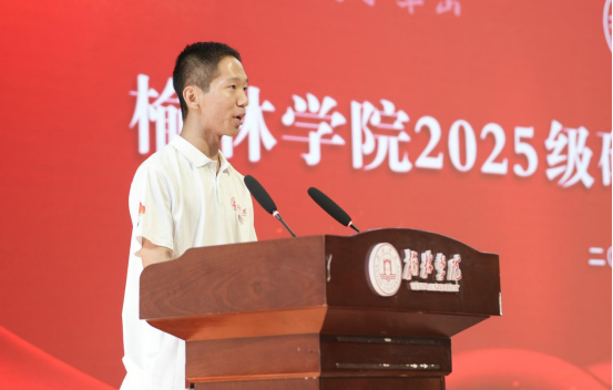 2025级研究生赵奕臣代表新生发言。他表示在新的阶段将以“求真”之心深耕学术、以“创新”之志突破认知、以“坚韧”之姿直面挑战,传承奋斗精神、践行读书报国使命,在服务国家与地方发展中绽放青春光彩。