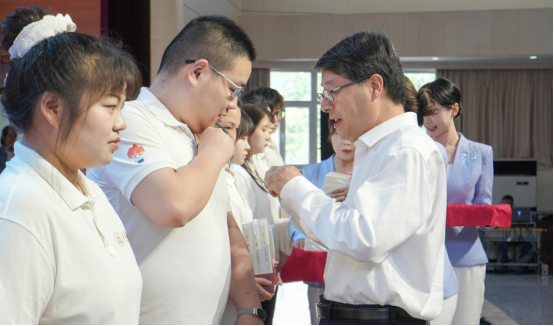党委书记张新柱为新生代表佩戴校徽并赠送《平凡的世界》