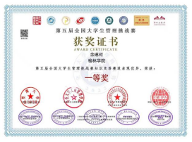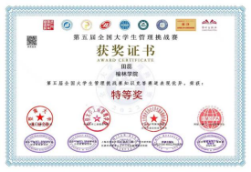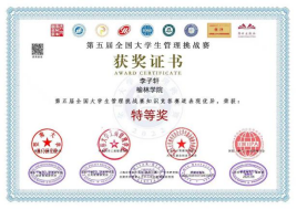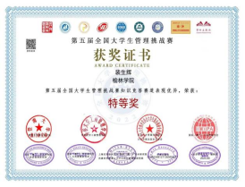 第五届全国大学生管理挑战赛由国际(澳门)学术研究院经济管理研究所、国际(澳门)学术研究院公共政策研究所、北京人才资源开发协会大学生就业创业专委会、国际(澳门)公共管理学会、暨南大学澳门研究院、华侨大学工商管理学院、上海应用技术大学一国际(澳门)学术研究院共建世界重要人才中心和创新高地研究院、学研出版社、《经济管理学刊》编辑部主办,澳门霍英东基金会资助。比赛自暑期启动以来,张霞老师积极动员学生参赛,并对参赛学生进行前期辅导。知识竞答个人赛采用线上答题形式进行,90-100分为特等奖,除荣誉证书外,组委会还为获奖者特别颁发了“青年管理学家”证书。