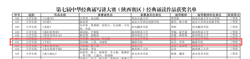 在近日公布的第七届中华经典诵写讲大赛(陕西赛区)获奖名单中,万象城研究生范欣嵘、王琪、刘雨彤三位同学的作品《不朽》力克群雄,荣获经典诵读赛项大学生组三等奖,用声音的力量为校争光!