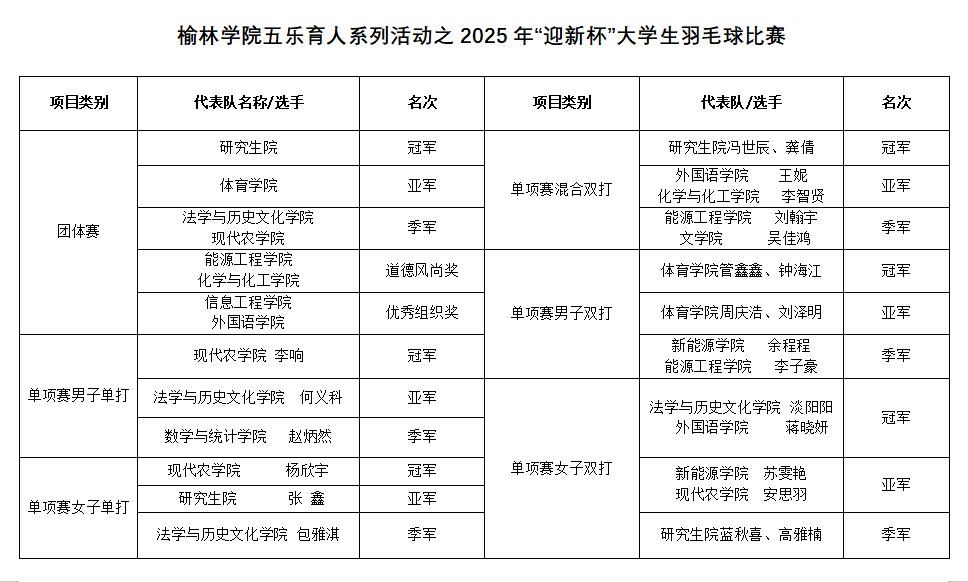 经过三日紧张激烈的角逐,各项目奖项尘埃落定。团体赛中,研究生院凭借强劲实力摘得冠军,体育学院斩获亚军,法学与历史文化学院、现代农学院并列季军;单项赛同样亮点纷呈:李响、何义科、赵炳然分获男子单打冠、亚、季军;杨欣宇、张鑫、包雅淇包揽女子单打前三名;混合双打项目中,冯世辰、龚倩组合夺冠,王妮、李智贤组合获亚军,刘翰宇、吴佳鸿组合摘得季军;男子双打赛场,管鑫鑫与钟海江、周庆浩与刘泽明、余程程与李子豪三组搭档凭借默契配合,依次斩获冠、亚、季军;女子双打项目里,淡阳阳与蒋晓妍、苏雯艳与安思羽、蓝秋喜与高雅楠三组选手以扎实功底脱颖而出,分获前三名。能源工程学院、化学与化工学院获“道德风尚奖”,信息工程学院、外国语学院获“优秀组织奖”。
