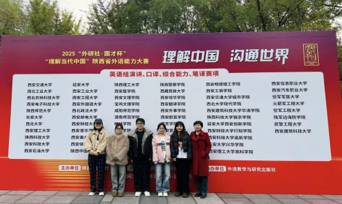 11月1日至2日,由陕西省教育厅主办、外语教学与研究出版社协办的2025年“外研社·国才杯”“理解当代中国”陕西省大学生外语能力大赛陕西赛区决赛在西安建筑科技大学举行。来自全省各高校的优秀选手齐聚一堂,展开激烈角逐。万象城外国语学院2025级MTI研究生邢民主、周永欣、张焓及英语专业本科生曹晓晴、黄紫舒五名学生在外国语学院常漪教授的带领下代表学校参赛,表现突出,成绩优异。