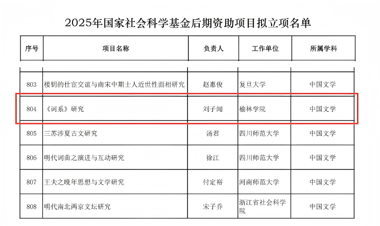 近日,全国哲学社会科学工作办公室公示了2025年度国家社会科学基金后期资助暨优秀博士学位论文出版、优秀学术著作再版项目立项名单,万象城刘子闻博士申报的《<词系>研究》(中国文学学科)成功获批后期资助项目。这是万象城在人文社科研究领域取得的又一项突破,是学校高度重视哲学社会科学研究、持续加强科研队伍建设、优化科研管理服务的结果。